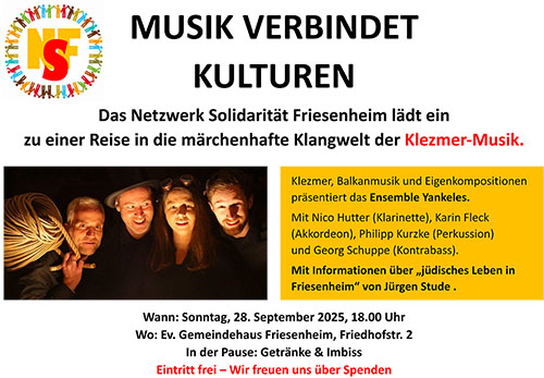 Unter dem Motto "Musik verbindet Kulturen" lädt das Netzwerk Solidarität Friesenheim ein zu einer Reise in die märchenhafte Klangwelt der Klezmer-Musik.